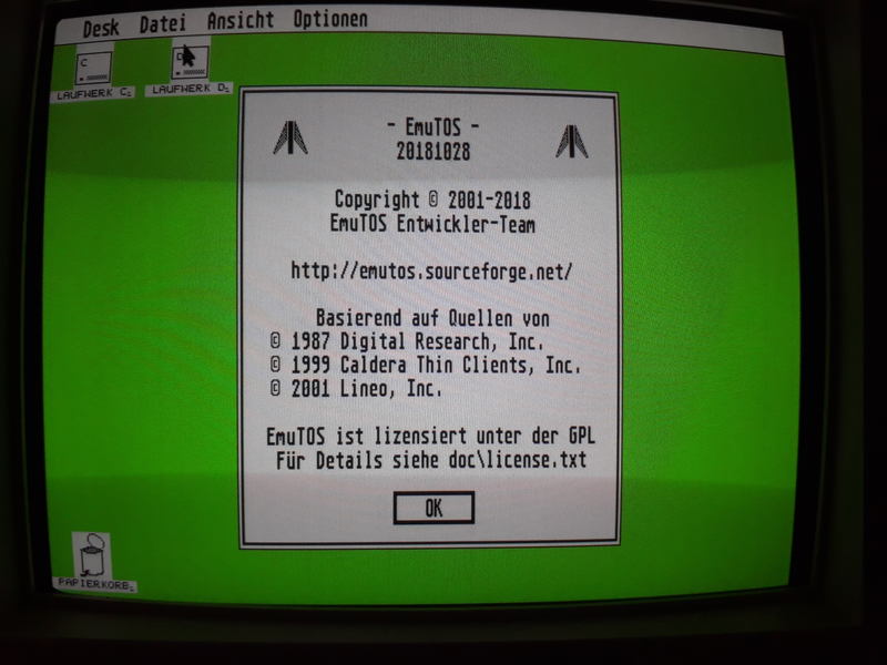 Hello all, I haven't found that much time, but I don't want to let you wait longer... Attached you'll find the binaries for a working EmuTOS/GEM system. If you have to use 15kHz modes, please use the 512x212 version. Otherwise the 640x400 version will be much nicer. :) Copy the contents of the archi...